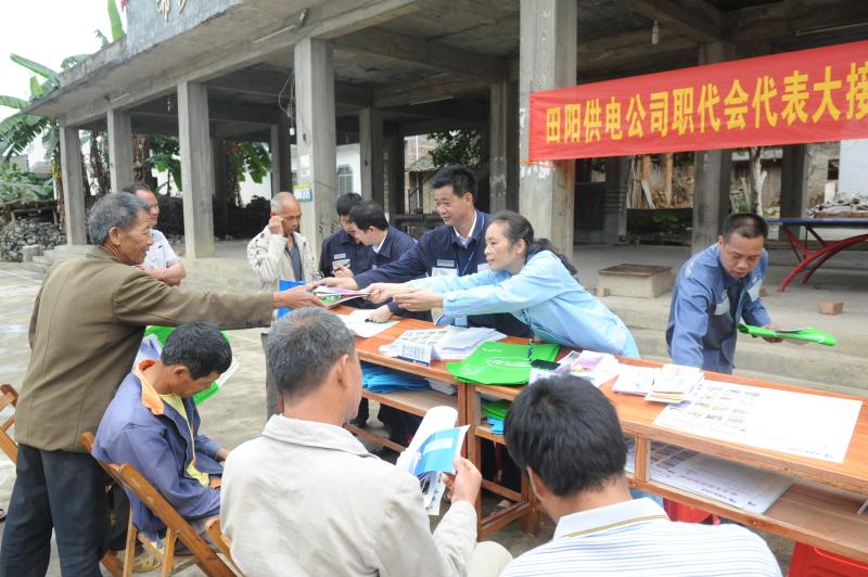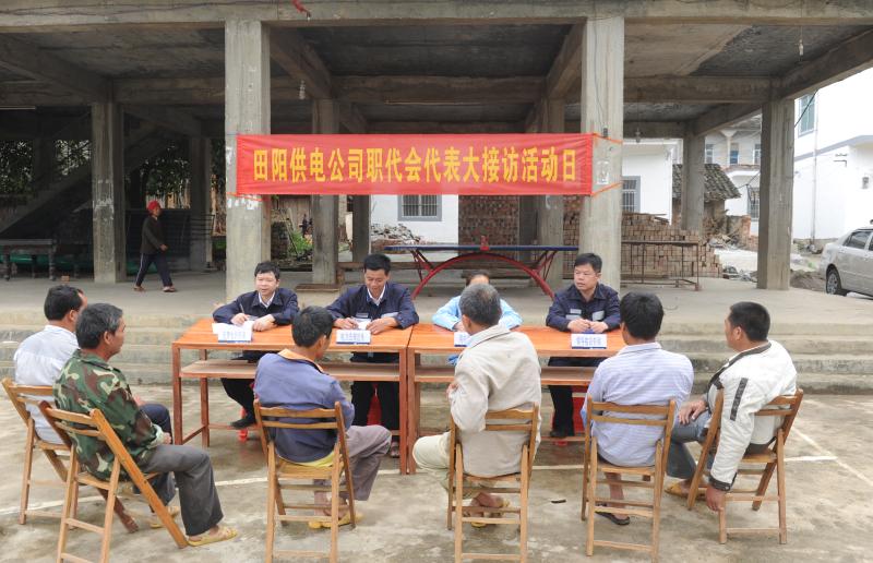 5月4日,在广西百色田阳县那满镇咘沙屯的篮球场上,由该屯队长黄建强选出的黄兴炮、李友彪和黄胜华等6名村民代表排排坐在一起,在他们的对面是田阳供电公司的4名职工代表。当天,该公司组织职工代表们走进农村,接地气、送服务,扎实开展职代会代表大接访活动。公司负责人表示:“进农村是我们‘六个一’活动的重点之一,我们一定要把群众的冷暖时刻记在心头,妥善解决他们遇到的每一个难题!”