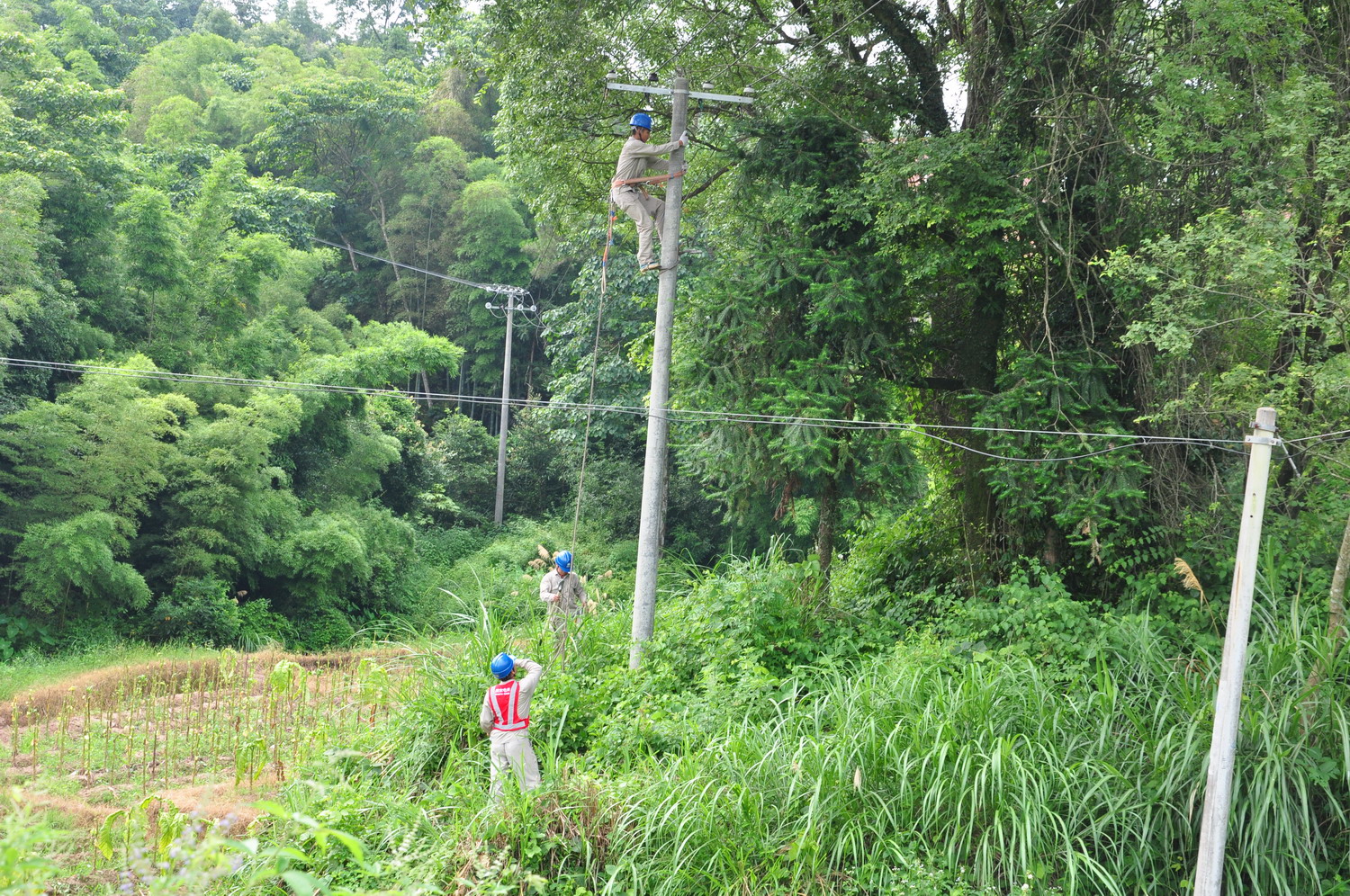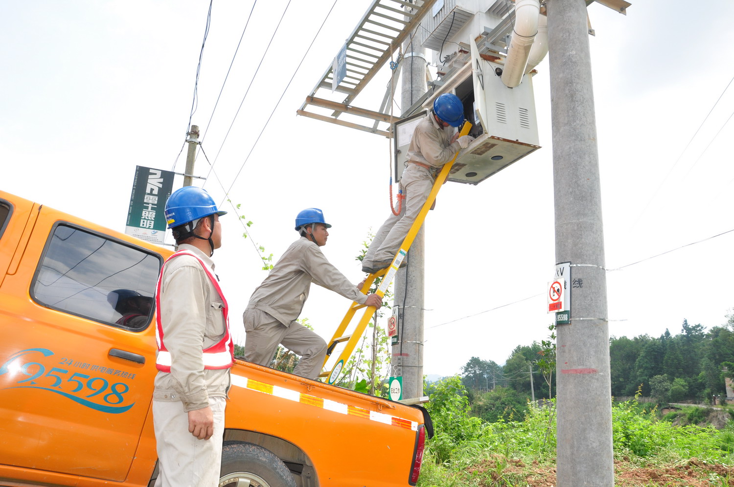 由于施工时间紧,天气炎热,朱传跃与工友们早上五点多便开工了。准备材料、停送电、安全交底……各项工作有序进行。上午10点,太阳已经开始显示了它的威力,毒辣辣的白光让人睁不开眼睛,温度迅速升高,变压器和电杆在烈日的暴晒之下已变得难以触手,但现场施工人员没有片刻停顿。