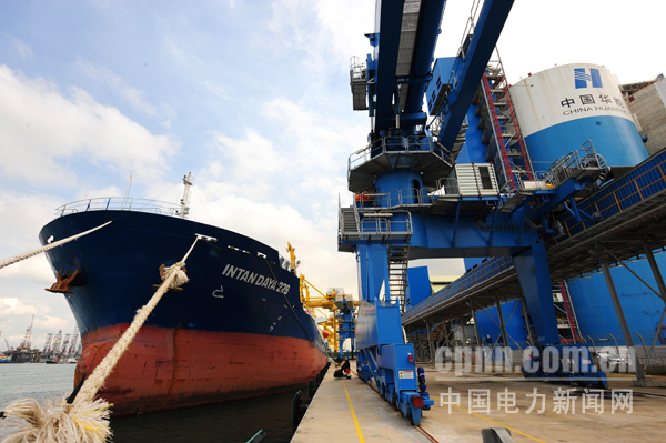 华能新加坡登布苏热电多联产项目运输燃煤和生物质的专用码头。一艘封闭式货轮正在向封闭煤仓卸煤,整个过程看不到一粒煤炭。王飞摄