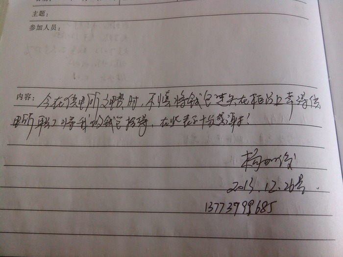 一通感谢电话引出了一个“拾金不昧”好员工的故事:2013年12月26日下午,下班时间已经过去了半个多小时,收费员徐旭仍然坐在营业厅内不住地往外张望着。一名中年男子急匆匆地跑进马塘供电所的收费厅,询问道:“有没有看到一个黑色的钱包?”徐旭拿出那个已经收了半天时间的黑色钱包问道:“是不是这个?”“就是这个,就是这个。”男子兴奋的说:“真是太谢谢你了。”“不忙!”徐旭师傅问:“你钱包里有些什么东西,麻烦确认下。”“有三百六十五块钱现金,身份证,最重要的是有一张建设银行的折子,里面有七万多的现金呢,是家里的急用钱,今天特意带在身上的。”“嗯,对了,钱包还给你,小心一点别再丢了,终于可以收拾收拾下班了。”“哎呀,谢谢你,你真是个好人!”中年男子打开钱包,抽出两百块钱现金,想要酬谢徐师傅。徐师傅轻松爽朗地回答道:“这是我们供电人应该做的,你收起来吧,我不会收的!”