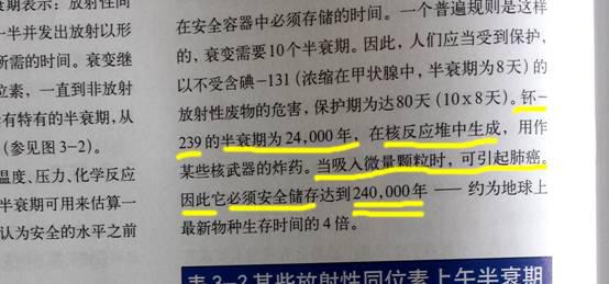 这是核电不可用的根本原因。20万年是难以想象的距离。秦始皇2000年,易经7000年,再往前的历史已经无法考证。如果混凝土寿命只有100年,那么数百年后(相对于历史的长河这只是一瞬间)所有的核废料都将毫无遮拦地裸露。“核废料污染周期”的论据来自《在环境中生存》第56页,“钚-239的半衰期为24,000年,在核反应堆中生成,用作某些核武器的炸药。当吸入微量颗粒时,可引起肺癌。因此它必须安全储存达240,000年——约为地球上最新物种生存时间的4倍。”