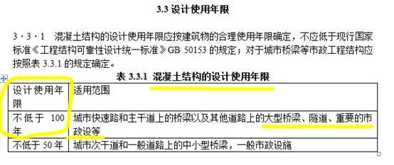 混凝土的寿命受多种因素的影响,100年是较高的标准,我们看到中华人民共和国国家标准《混凝土结构耐久性设计规范》所规定的混凝土年限,“大型桥梁、隧道、重要市政设施的设计使用年限”是“不低于100年”。