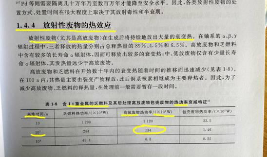 这是核废料无法处置的根本原因。如果是一个死的东西,深埋于地下,只要没有地下水冲刷,它就永远存在那里。但因为它不断散热,埋于地下会让周围的岩石变成熔岩,最后形成火山爆发。如果沉于海底,它也会不甘寂寞,通过热量的带动与表层的海水对流,然后被带到整个海洋。核废料功率密度的论据来自于《放射性废物处理与处置》一书第19页,放射性废物的热效应,表1-8,高放废物在离堆100年后热功率为13.4千瓦/吨。
