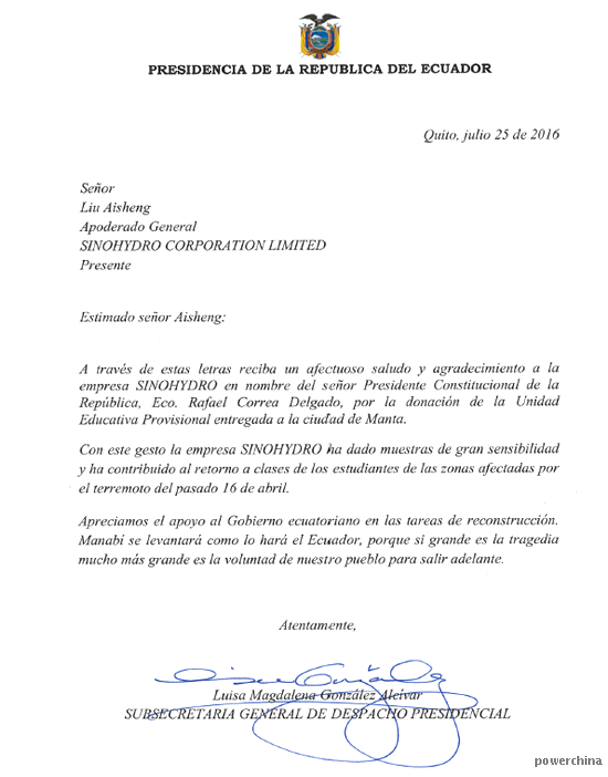 科雷亚总统表示“中国电建心系灾区,用丰富的施工经验和精湛的管理组织,使得灾区学生在最短时间内重返学校。我们万分感谢中国电建在重建工作中向厄政府提供的支持。地震无情,可是比地震更强大的是我们国家重振旗鼓的决心”。